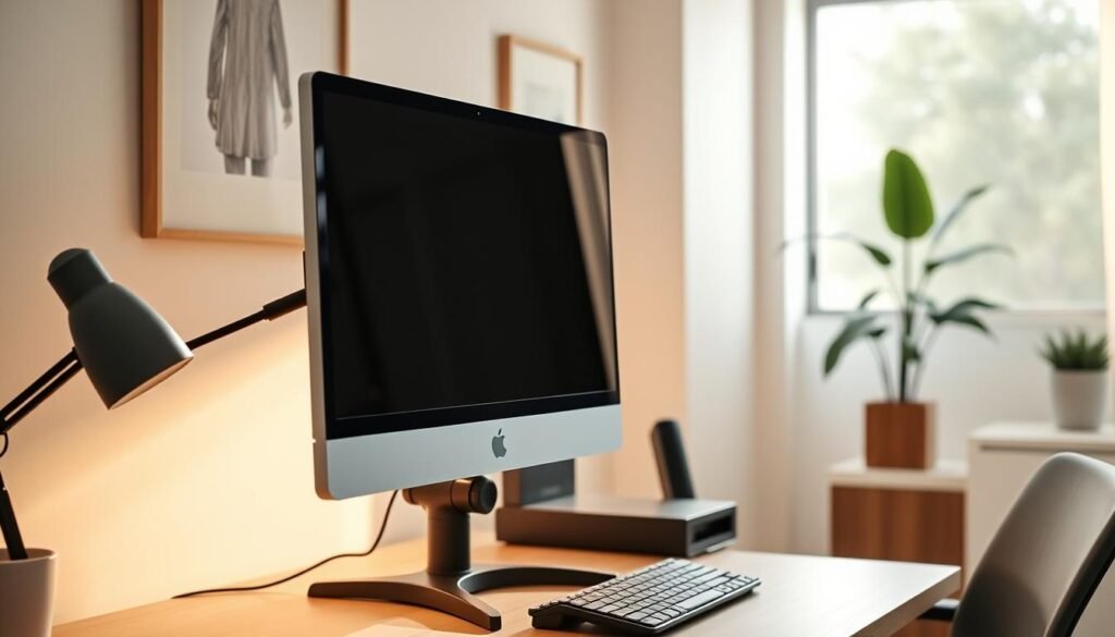 Se você usa um computador portátil, considere investir em um suporte para elevar a tela à altura correta. Isso melhora a postura e reduz a tensão no pescoço. Para quem trabalha com múltiplos monitores, o ideal é posicioná-los em um ângulo que permita uma transição suave entre as telas.