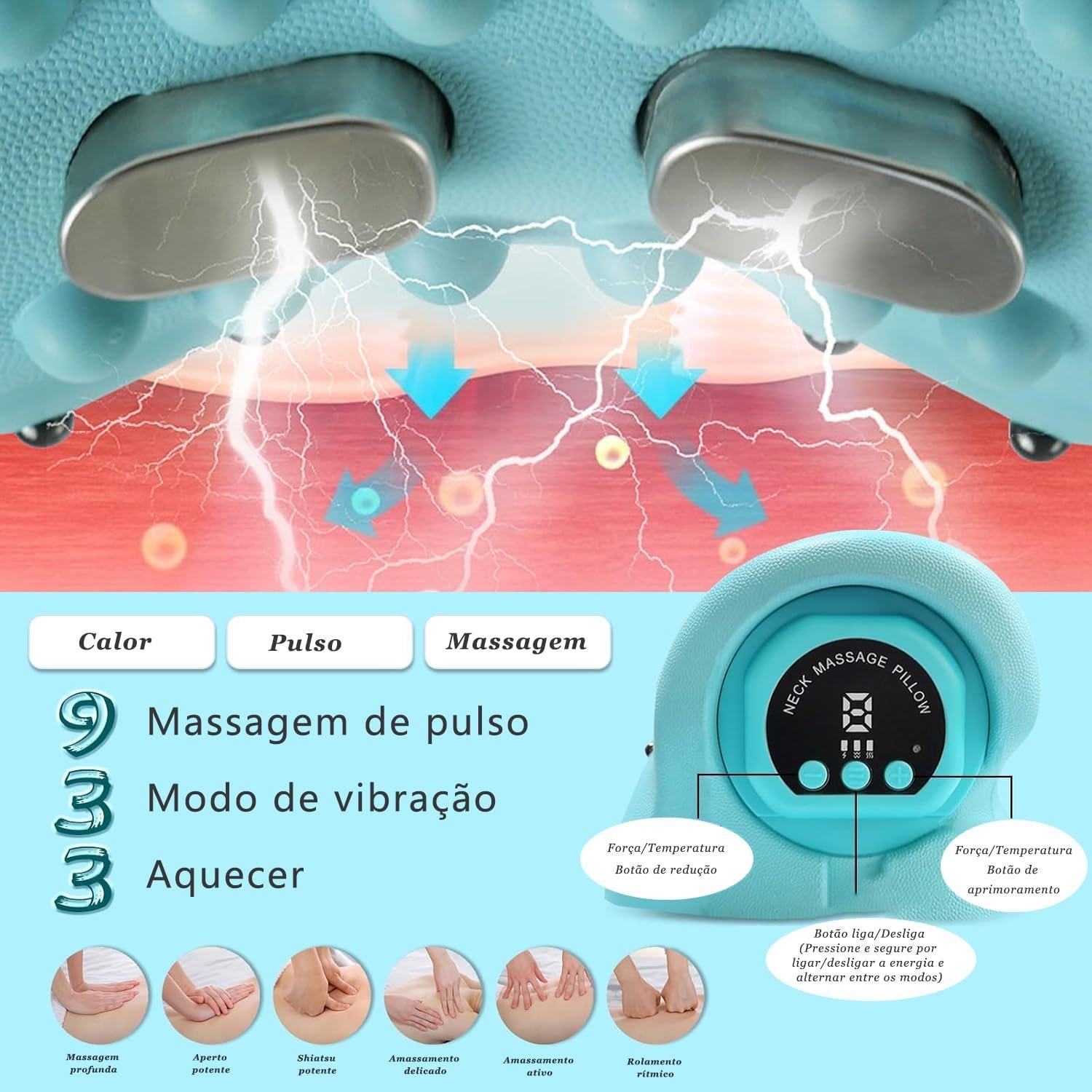 - Posso usar a almofada massageadora em outras partes do corpo? Sim, ela pode ser usada nas costas, pernas e outras áreas que necessitem de massagem.