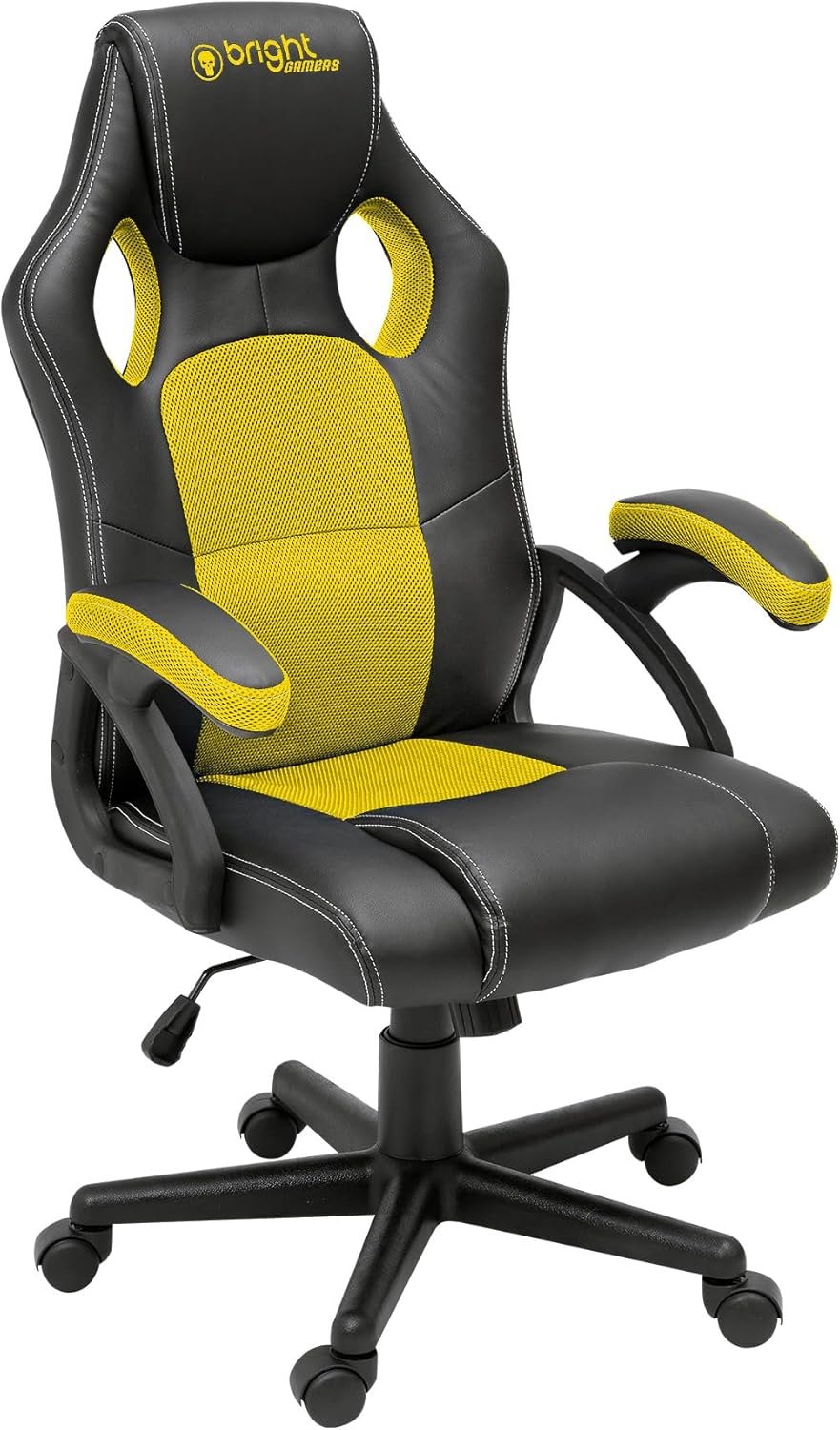 Bright, Cadeira Gamer na cor Preto e Amarelo, Regulagem de Altura, Rodízio em Nylon, Braços de Apoio em Polipropileno com Acolchoado, Possui Inclinação de Amortecimento e 3 Níveis de Altura