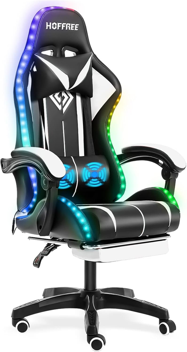 Review: I love the screws were pre assembled, I really love the color because I wanted little to no black on my gaming chair , the massager feels awesome , the foot rest is nice when I wanna game with a controller. The head rest is awesome tooI love all the color options and modee available you can even adjust the brightness and speedIt’s very comfy I worried I would be too big for it but I fit well once I adjusted everything