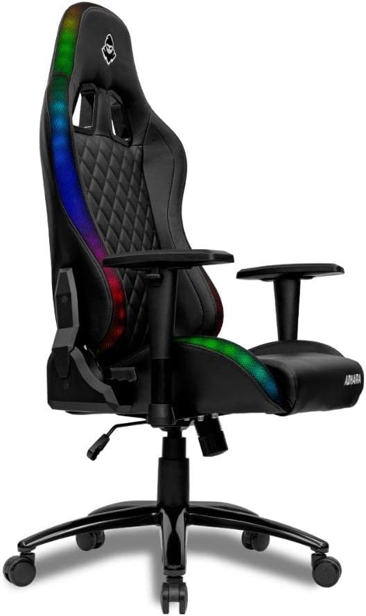 A Adhara tem um design agressivo, típico das cadeiras gamer, com linhas que lembram bancos de carros esportivos. O revestimento em couro sintético PU é bonito e fácil de limpar (o que é ótimo para quem, como eu, vive derrubando alguma coisa enquanto joga). O toque de RGB dá um charme extra, com iluminação personalizável que combina com o setup de qualquer gamer.
