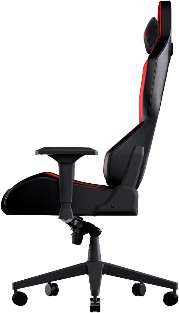 O visual, como já disse, é impactante. O esquema de cores vermelho “Magma” com detalhes em preto é bem chamativo, e o acabamento em couro sintético (PU) parece ser de boa qualidade. As costuras são bem feitas e dão um ar de sofisticação. A base é robusta e as rodinhas deslizam bem, o que é essencial pra não ficar “preso” na cadeira durante a partida.