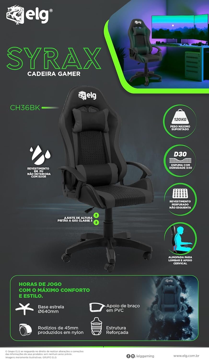 A Cadeira Gamer Syrax CH36BK ELG suporta até 120kg.