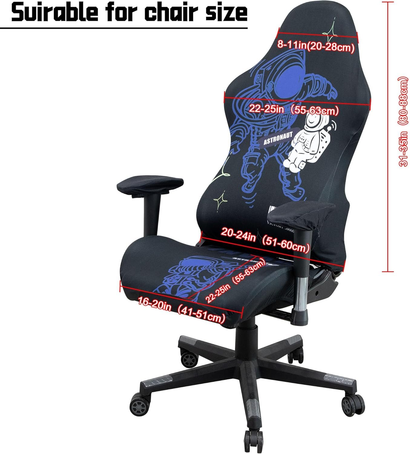 Review: Works great. Surprisingly fits without much effort on a myriad of “gaming” style high-backed chairs. My particular chair was an off-brand bought at an office supply store (on the cheap.) It is a comfortable chair, but it is made from that awful heat-trapping vinyl.This is MUCH more comfortable and is so simple to install. It is two pieces, since the backs and seats of these chairs are not always uniform. It couldn’t be easier to fit on the chair. From unpacking to sitting in my covered chair was less than 10 minutes.The colors are a bit silly, and the patterns are funny, but the comfort and fit cannot be beat. Excellent covers.